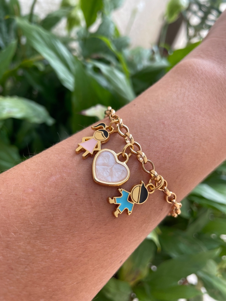 Conheça a Pulseira Filhos , uma peça incrível que celebra o amor incondicional! Com um design delicado e moderno, ela é banhada a ouro, garantindo uma durabilidade excepcional graças ao verniz inglês e italiano, muito utilizado por grandes marcas. Essa pulseira é perfeita para aquelas mamães que querem carregar um pedacinho dos seus filhos sempre com elas!